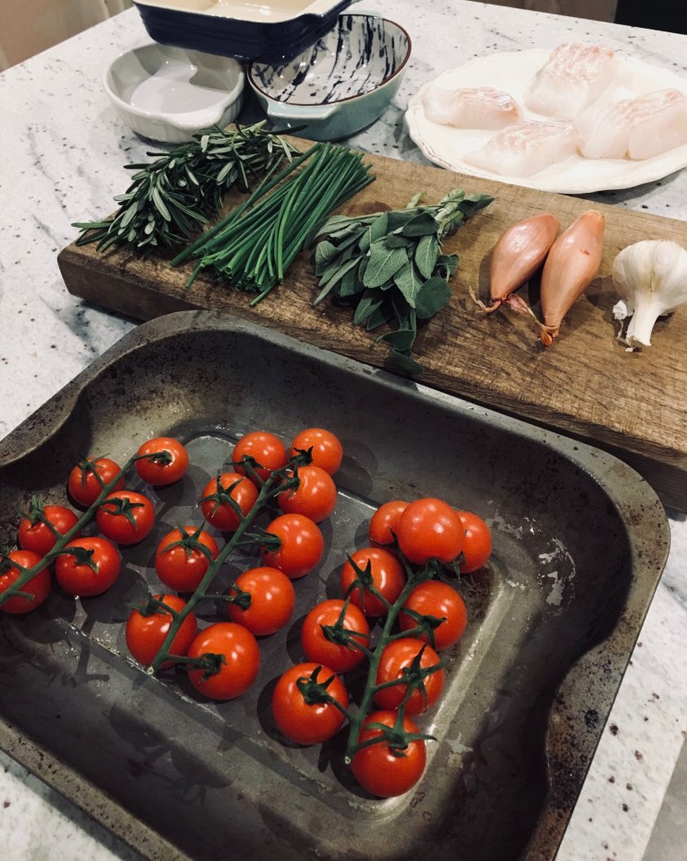 - To begin this dish place your cherry tomatoes into a large gastro tray, drizzle with olive oil.