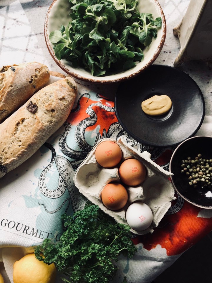Next warm through an artisan loaf of olive bread, wash and dress lambs lettuce with a little twist of lemon, olive oil and sea salt.