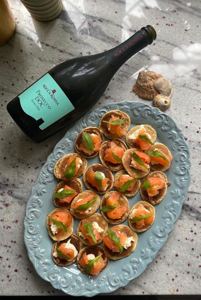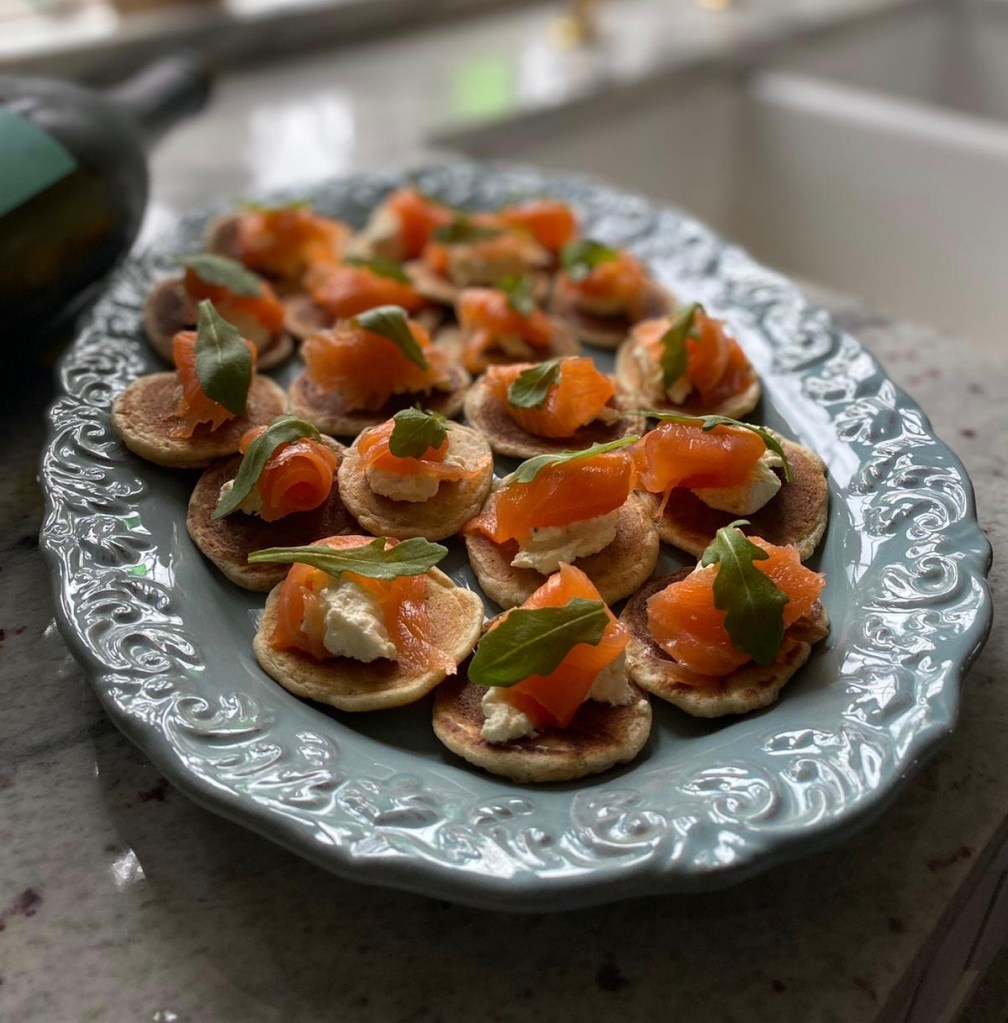Blinis made using my sourdough culture of course, topped with cream cheese, smoked salmon, garnish, a squeeze of lemon and a generous sprinkle of black pepper