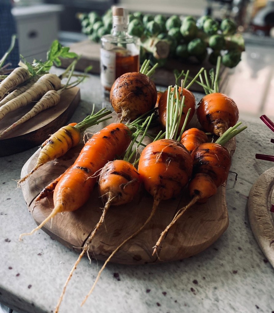 Carrots, parsnips, beets and brussels – which have been awaiting winter harvest. Grown from seed and now on the kitchen table.