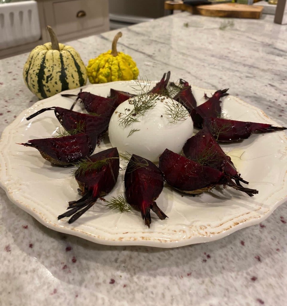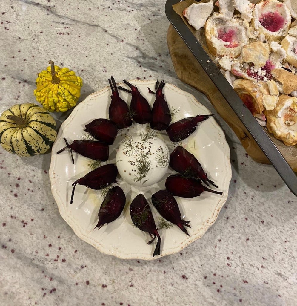 To plate pre-warm an artisan plate, arrange your carrots to the left hand of the plate dress and top with your pesto, allowing the oil to run a little. Next add your burnt onions in a three at the top of the plate, followed by your roasted potatoes, lastly top with your honey roasted walnuts and fresh fennel shoots.