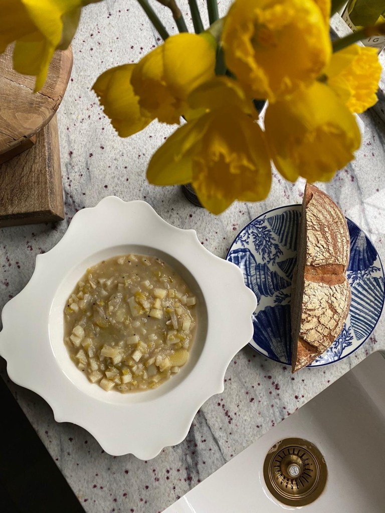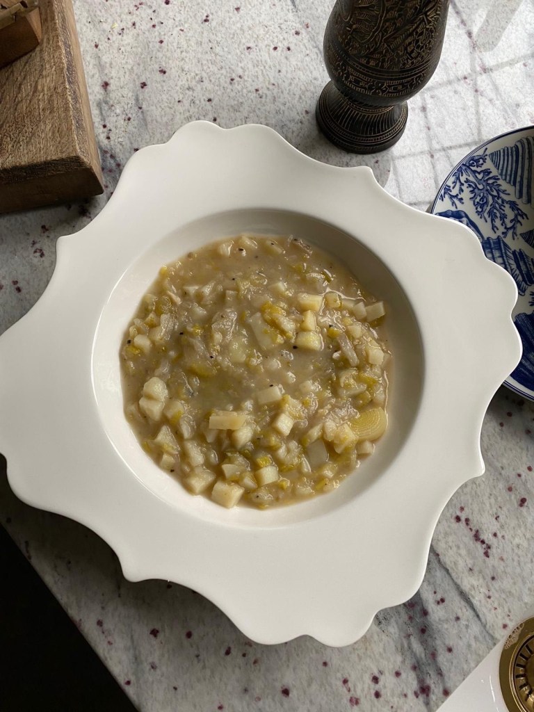 By reducing the stock you help to amplify the flavour, then add your potatoes along with your sliced leeks and allow to poach till the potato’s are la dente.