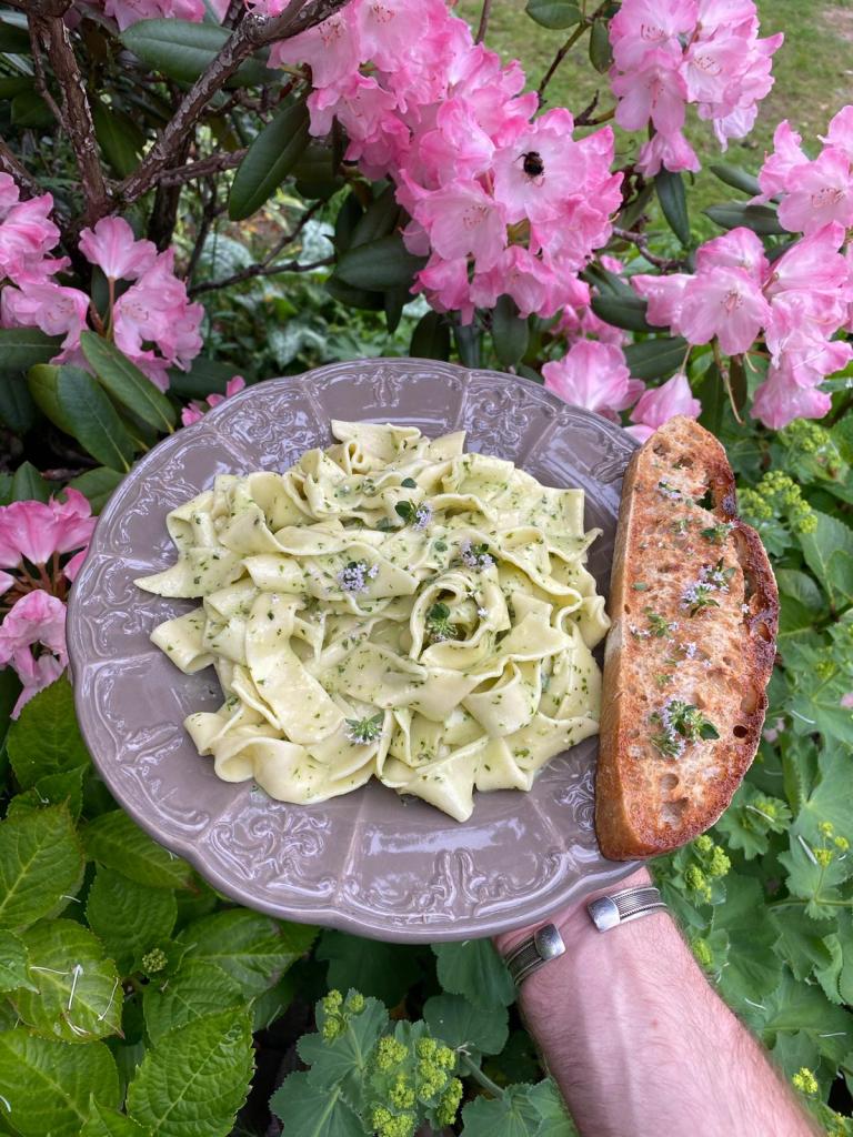 Garden herb pesto stirred through fresh pappardelle, served with sourdough bruschetta with roasted garlic and flowering thyme