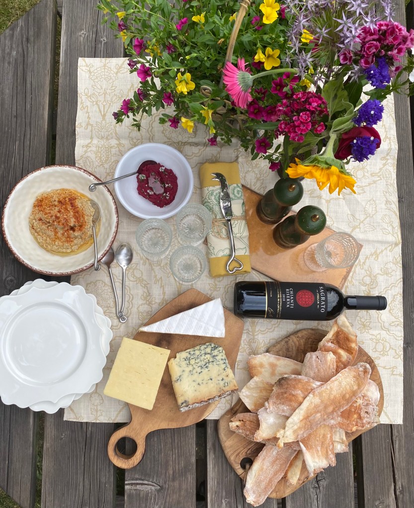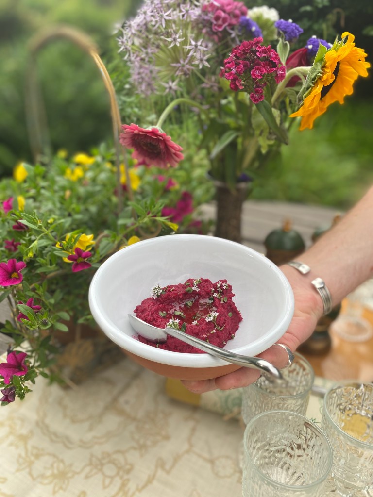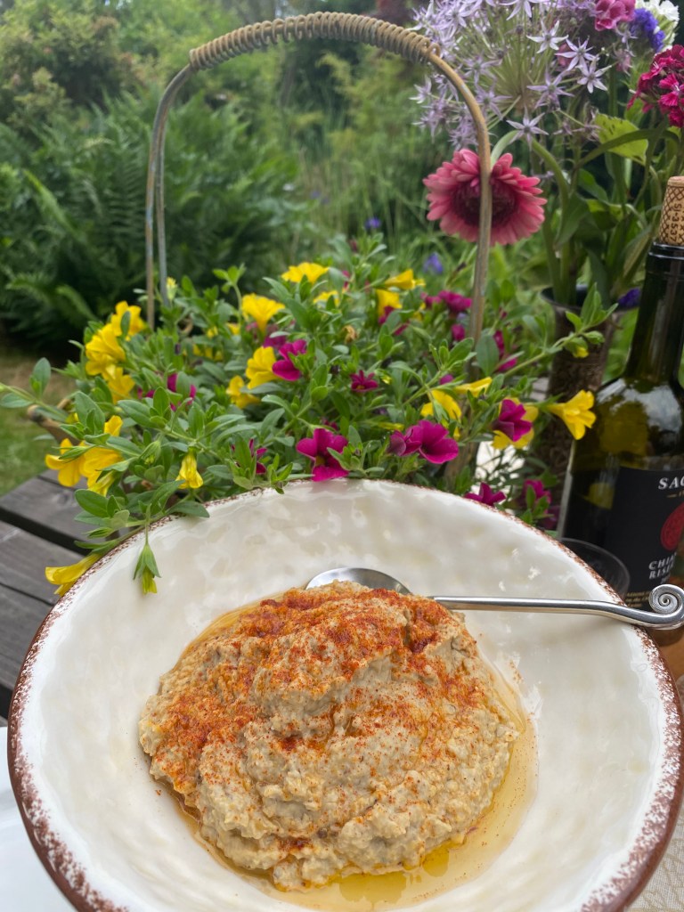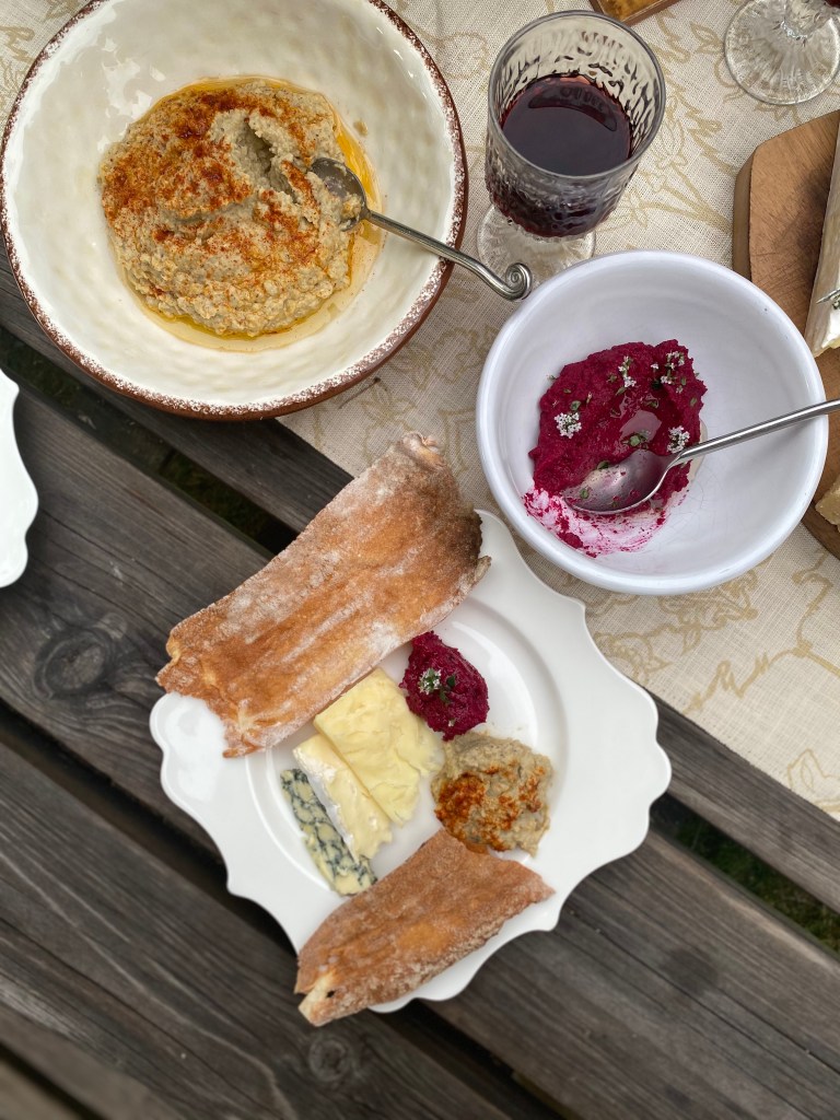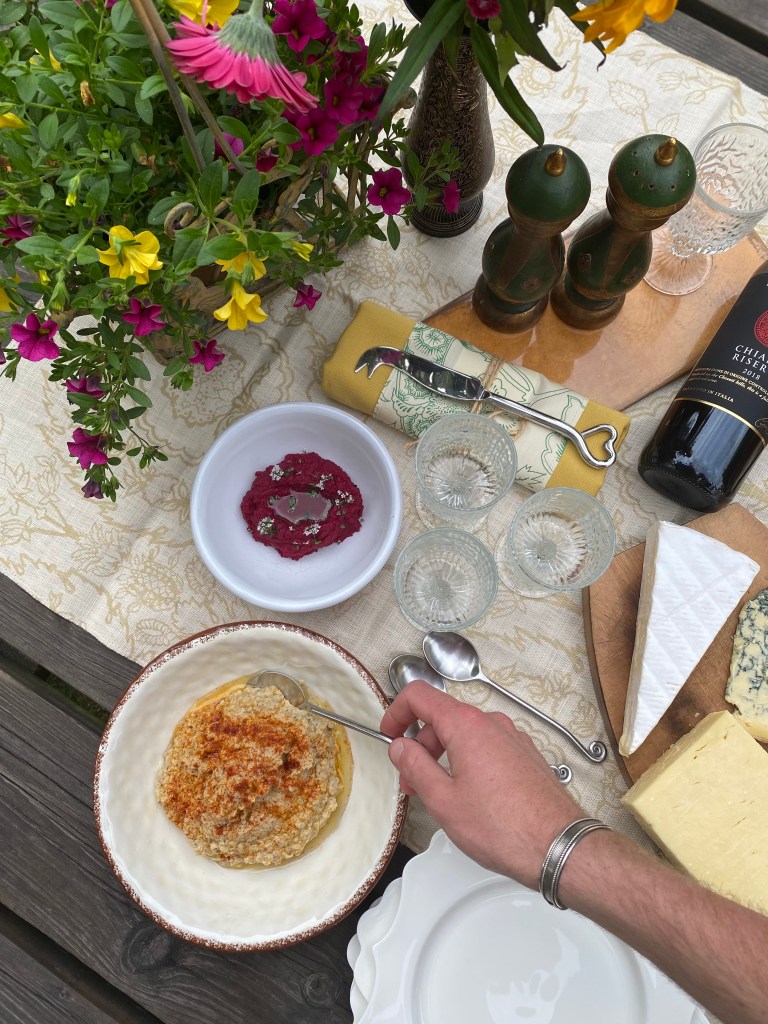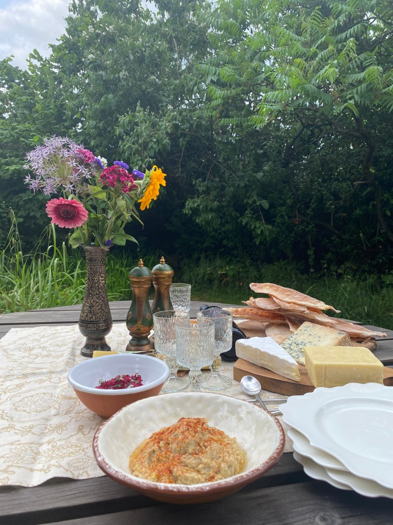 Back when we had a glimmer of Summer – this selection of cheeses, GG sourdough crackers, roasted aubergine, baba ganoush, beetroot hummus with flowering time was a real hit!