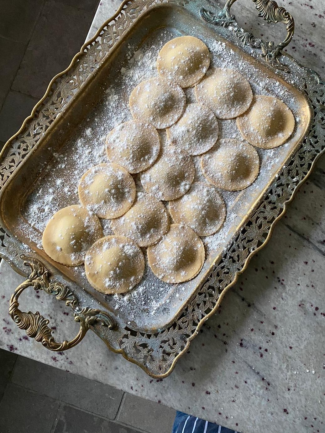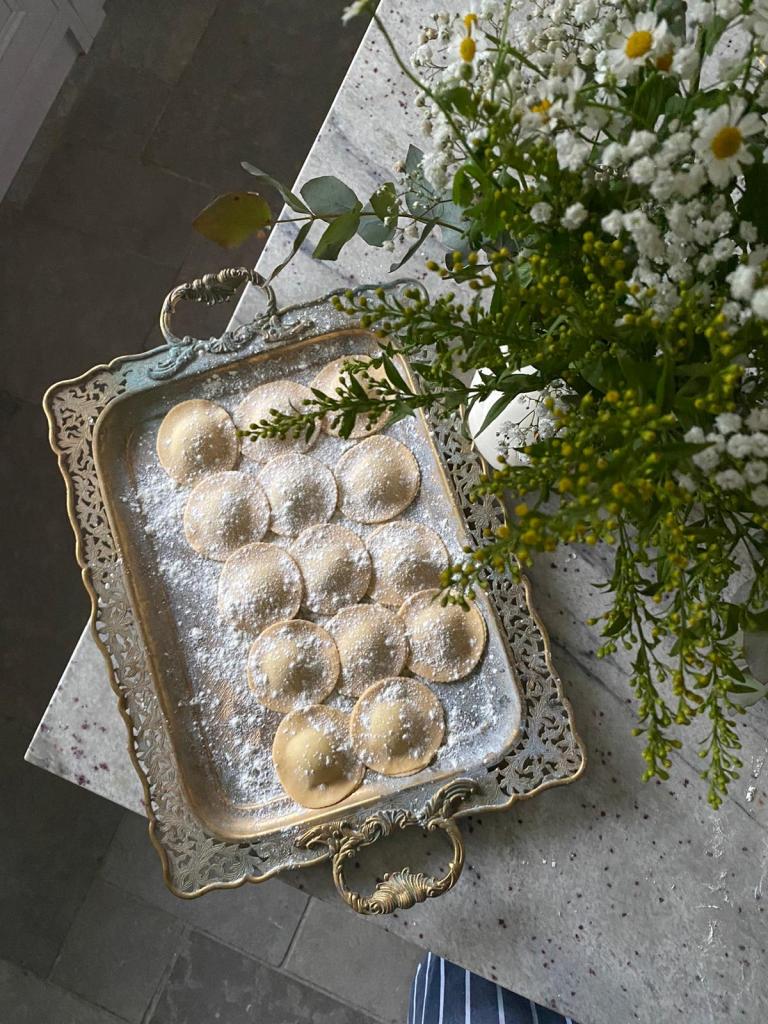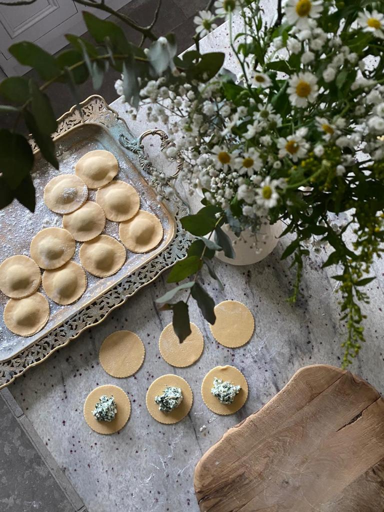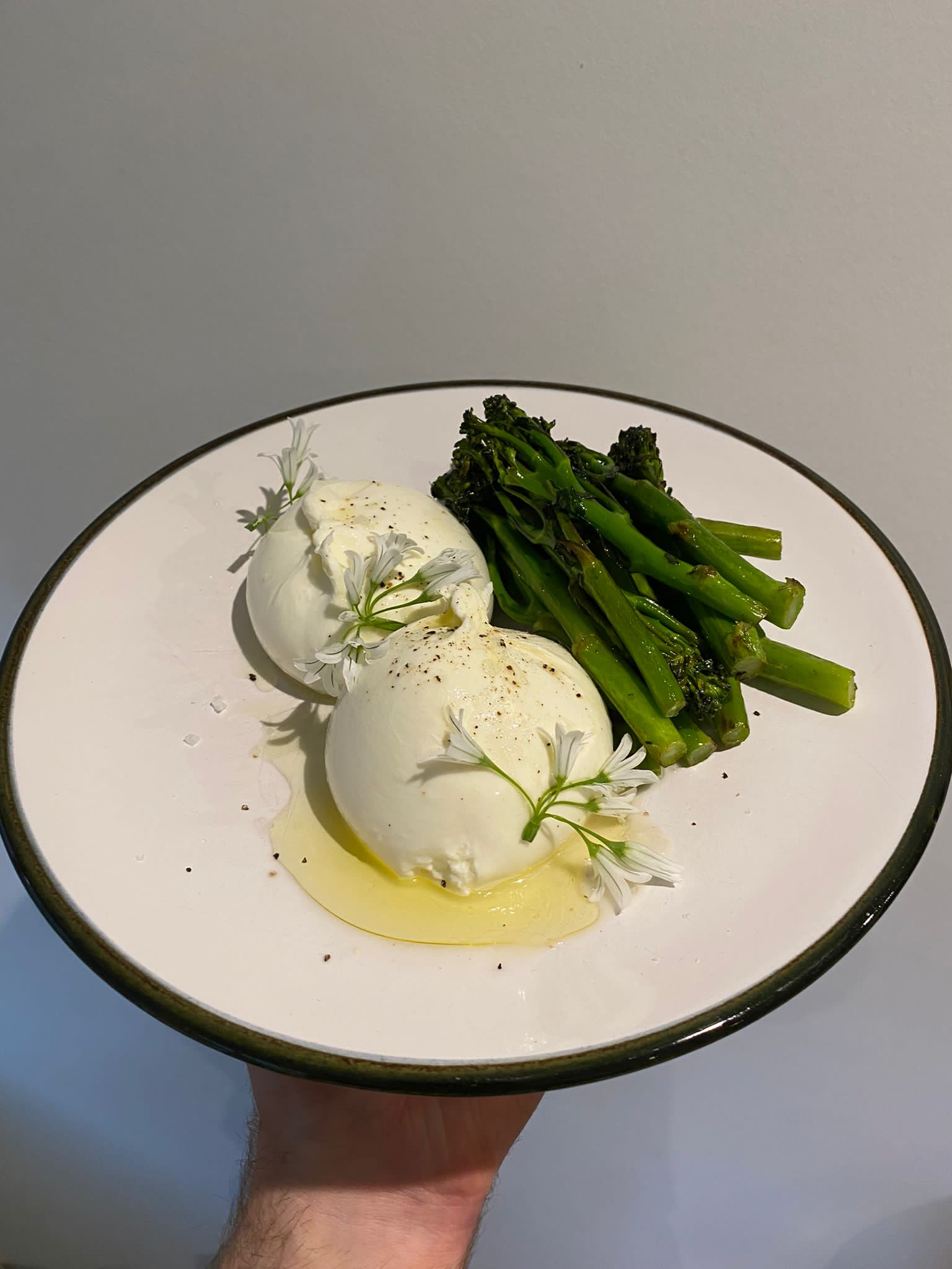 With burratas, grilled purple sprouting broccoli, three cornered leeks. Followed by hand cut pappardelle, Gorgonzola, Parmesan and three cornered flowers.