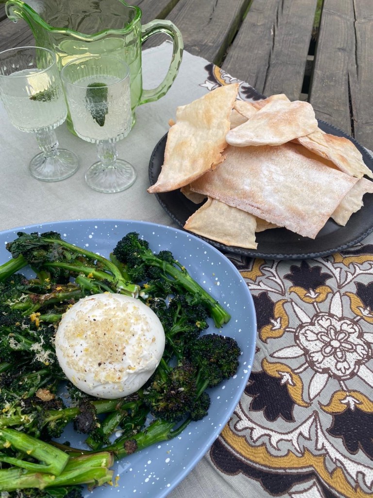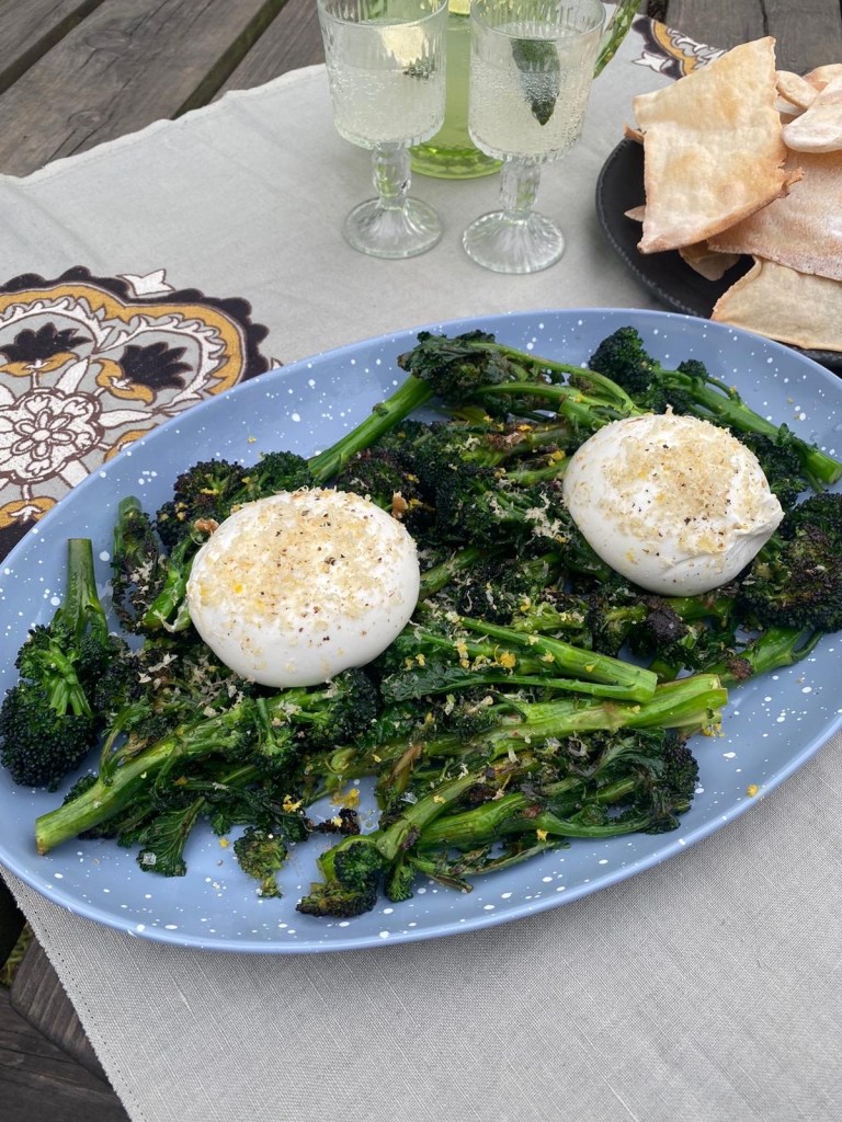 Served with purple sprouting broccoli, walnut, and burrata salad