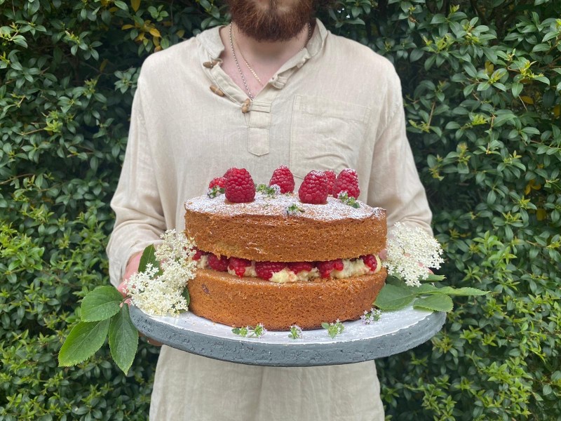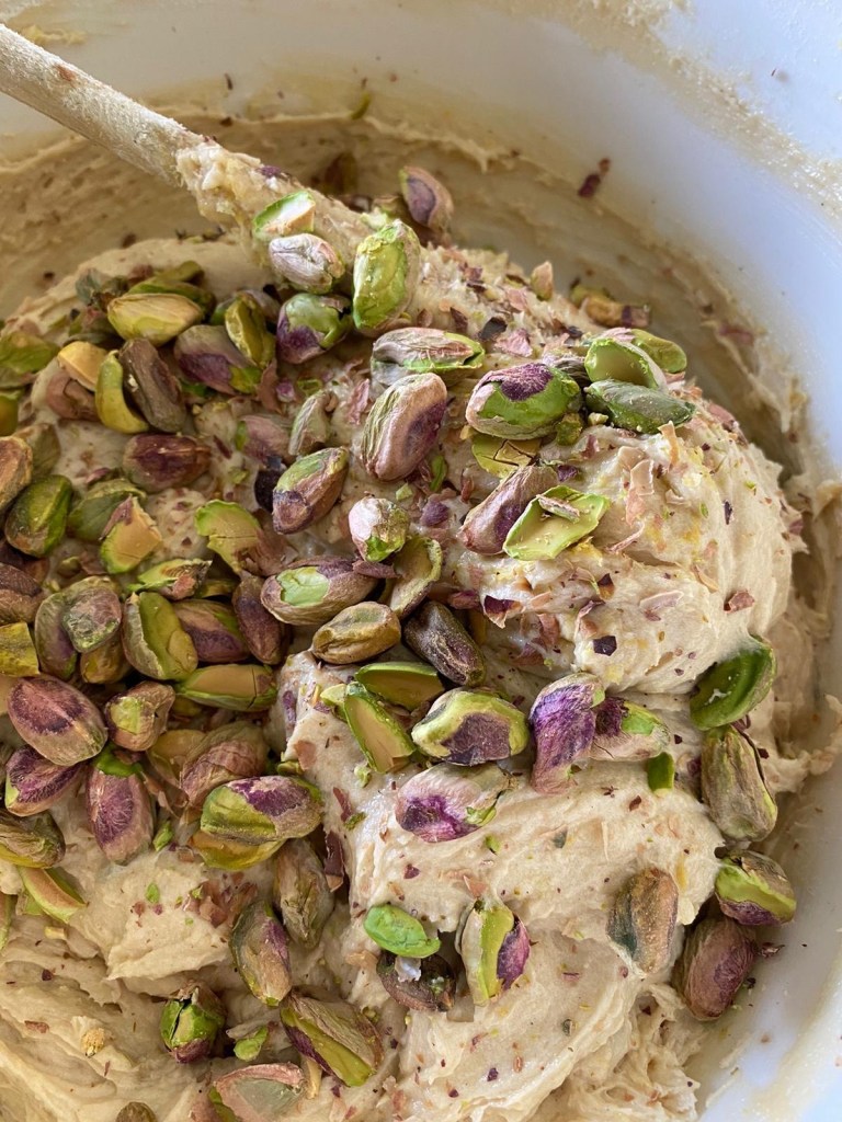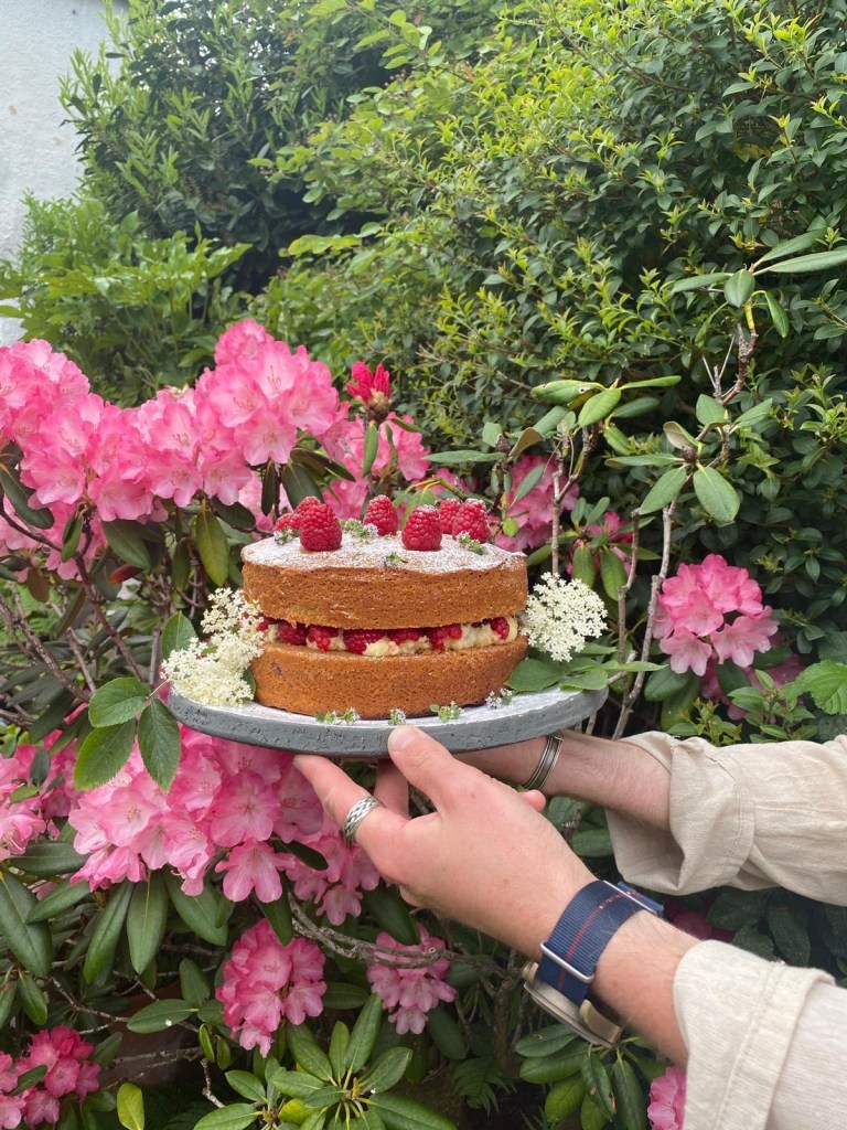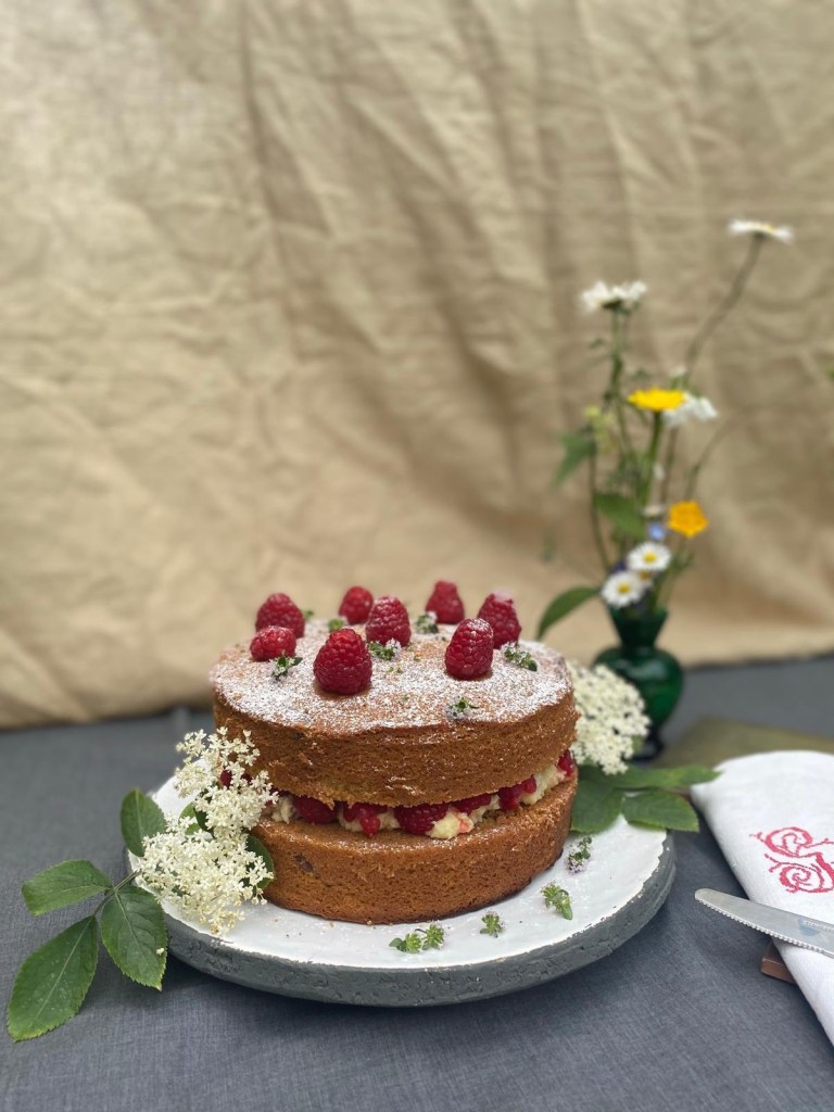 My rose water and pistachio lemon sponge with fresh raspberries and pistachio infused butter cream