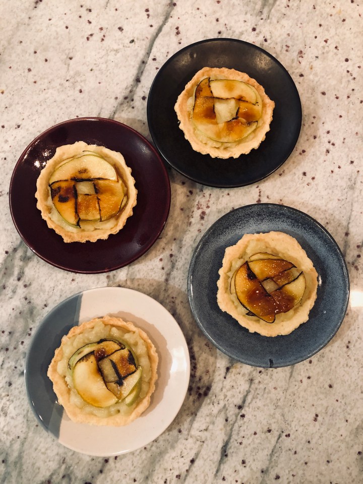 2. Dust with a little caster sugar, using a blowtorch glaze the apple slices – this helps to add a little crunch to apples and gives them a great shine.